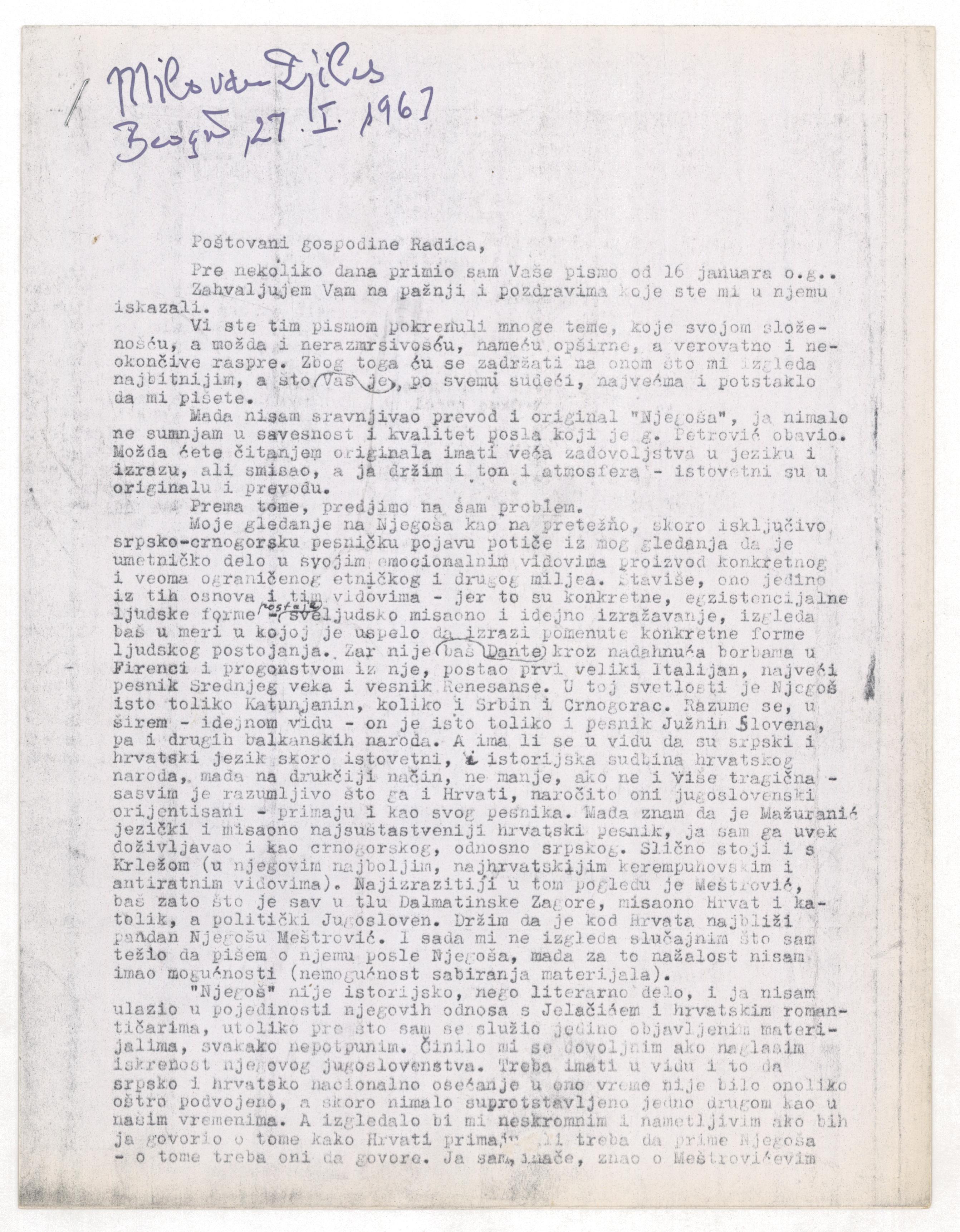 Letter of Milovan Đilas to Bogdan Radica, 27 January 1967