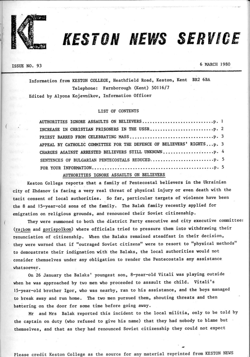Keston News Service Issue No. 93, London, 1980. Newswire.