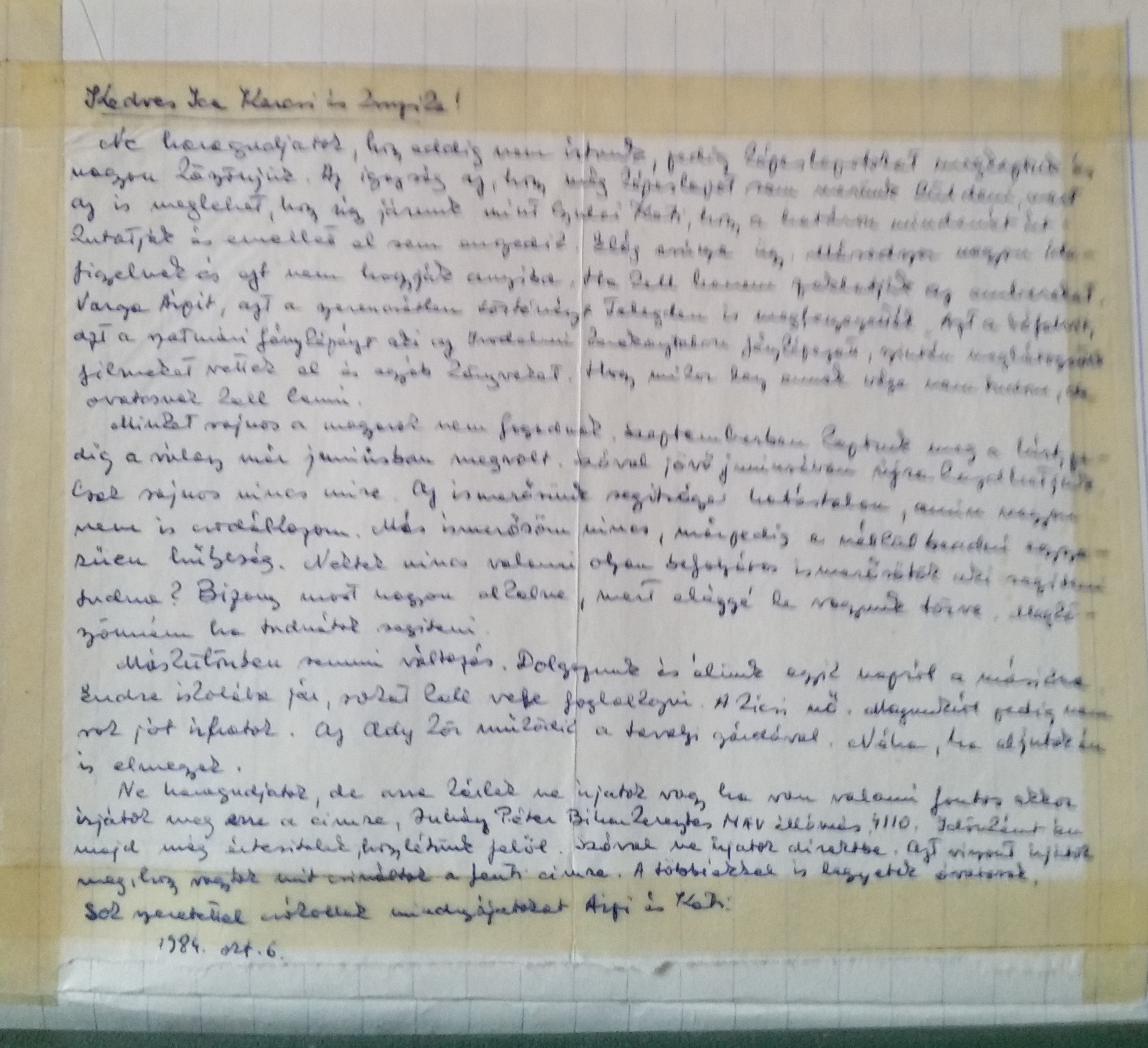 Scrisoarea „trecută ilegal” peste granița româno-maghiară, în limba maghiară, 6 octombrie 1984 (dimensiunile scrisorii: 15 cmx14cm)