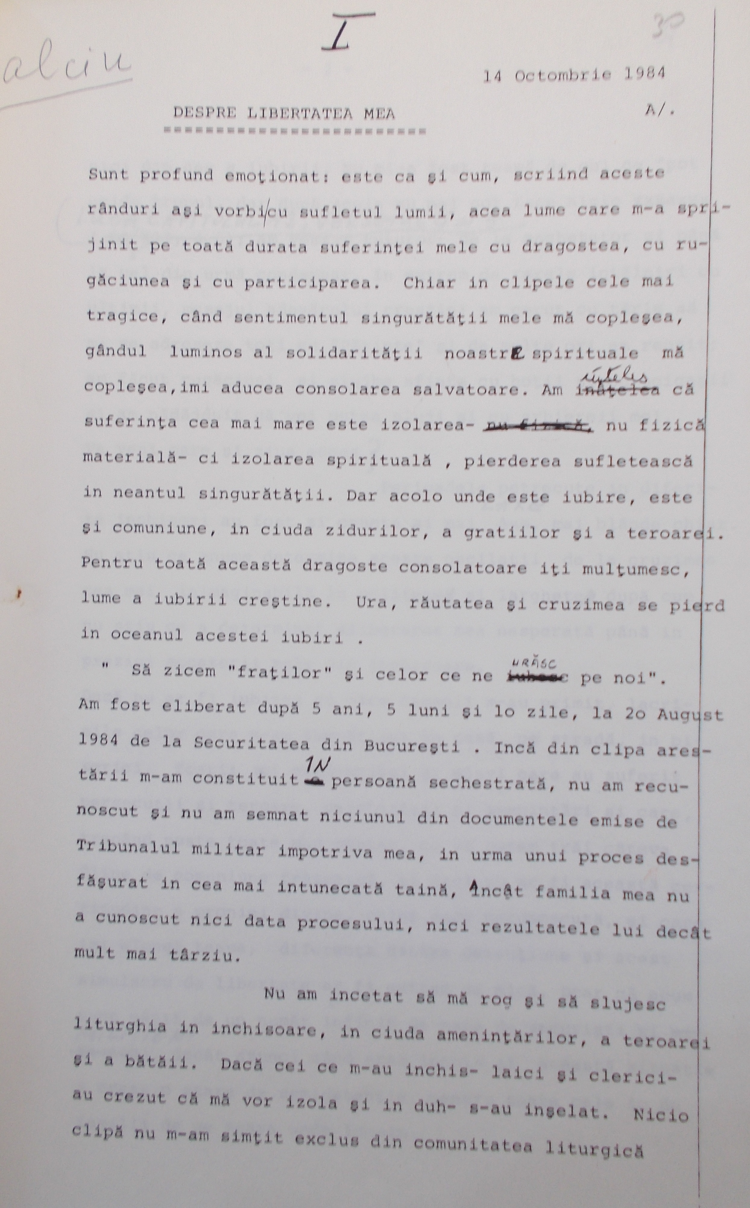 A former political prisoner, Calciu-Dumitreasa was imprisoned again in 1979 after delivering a series of seven sermons for young people the previous year. Through his sermons, Father Calciu-Dumitreasa hoped to strengthen the faith of young people whose Christian spiritual life was threatened by communist atheism and materialism (Petrescu 2013). The letter written by Father Calciu-Dumitreasa describes his situation and the situation of his family after his release from prison (August 1984) due to a huge campaign organised by the Romanian diaspora, and also makes known to the listeners of RFE’s Romanian desk his decision to emigrate.