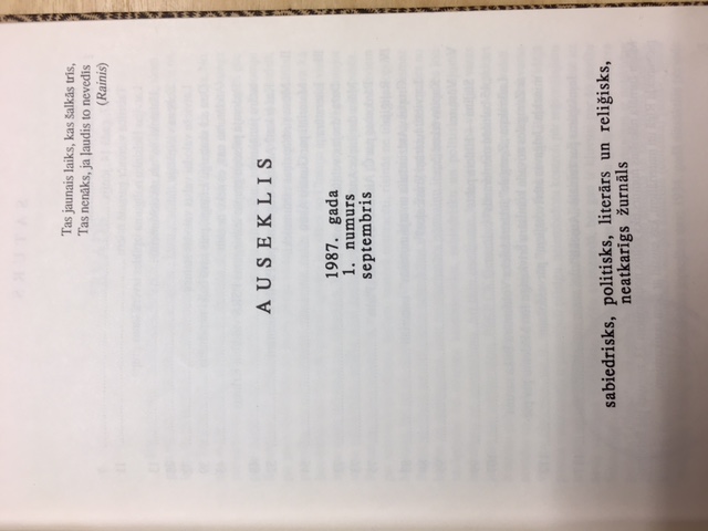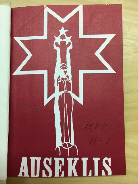 The collection consists of three photographed copies of the periodical Auseklis (October-November 1987; January 1988; April 1988). It is not at present exhibited in the display of the Museum of the Occupation of Latvia in its temporary location, but it will be shown in the permanent exhibition after the renovation of the museum's permanent building. The Auseklis review is a brilliant example of what the focus of public interest and discussion was in the early years of the development of the pro-independence movement.