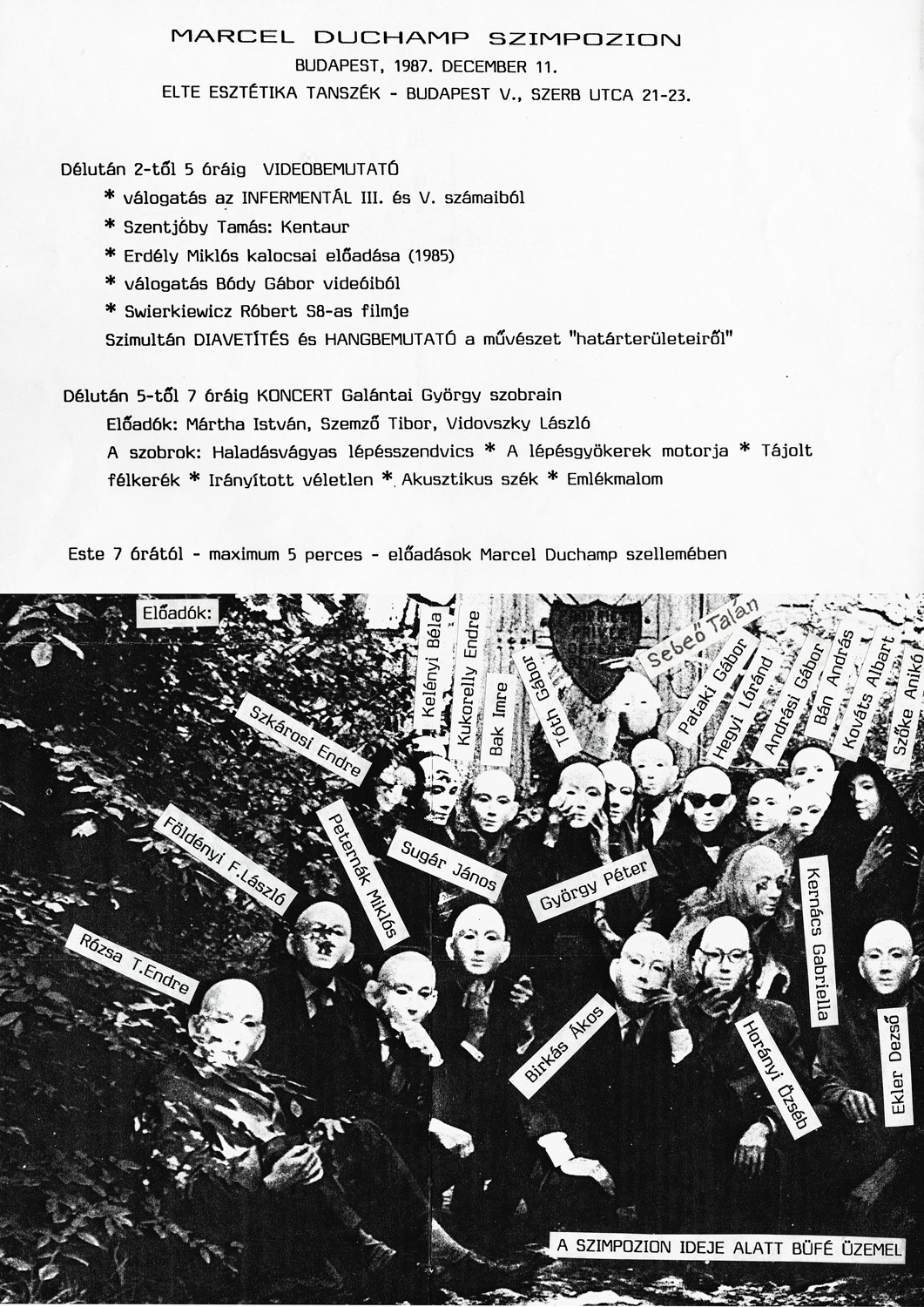 Artpool organized a symposium to commemorate the 100th birthday of Marcel Duchamp in cooperation with the Department of Aesthetics at Eötvös Loránd University, Budapest (organizers: György Galántai and Péter György). The symposium was preceded by a call for applications announced by Artpool for international artists to cooperate in the event by sending artworks, documents, projects related to the spirit of Duchamp. Among the participants, one finds artists like Vittore Baroni, Robin Crozier, Christo, Klaus Groh, Ruth Wolf Rehfeldt, etc. Artpool organized an exhibition based on the received materials entitled In the spirit of Marcel Duchamp. Concerts, sound presentations, video-screenings, slide projections and short presentations were parts of the program of the symposion. Tibor Szemző (piece for Directed Chance), András Wilhelm & Zoltán Rácz (concert on five sculptures) and István Márta (Multimedia sound improvisation on two sculptures and a video) gave concerts on György Galántai’s sound sculptures. Tamás Szentjóby’s Centaur, Miklós Erdély’s Lecture in Kalocsa and András Szirtes’ Diary were being screened. Ray Johnson’s letters, mail art and sound materials were projected from slides. The following lecturers held five minute-long talks, evoking Duchamp by measuring time with a chess clock: Gábor Andrási, Imre Bak, László Beke, Ákos Birkás, Dezső Ekler, László Földényi F., Péter György, Lóránd Hegyi, Özséb Horányi, Gabriella Kernács, Albart Kováts, Endre Kukorelly, Gábor Pataki, Miklós Peternák, Endre Rózsa T., Talán Sebeő, János Sugár, Endre Szkárosi, Annamária Szőke, Ádám Tábor, Gábor Tóth.