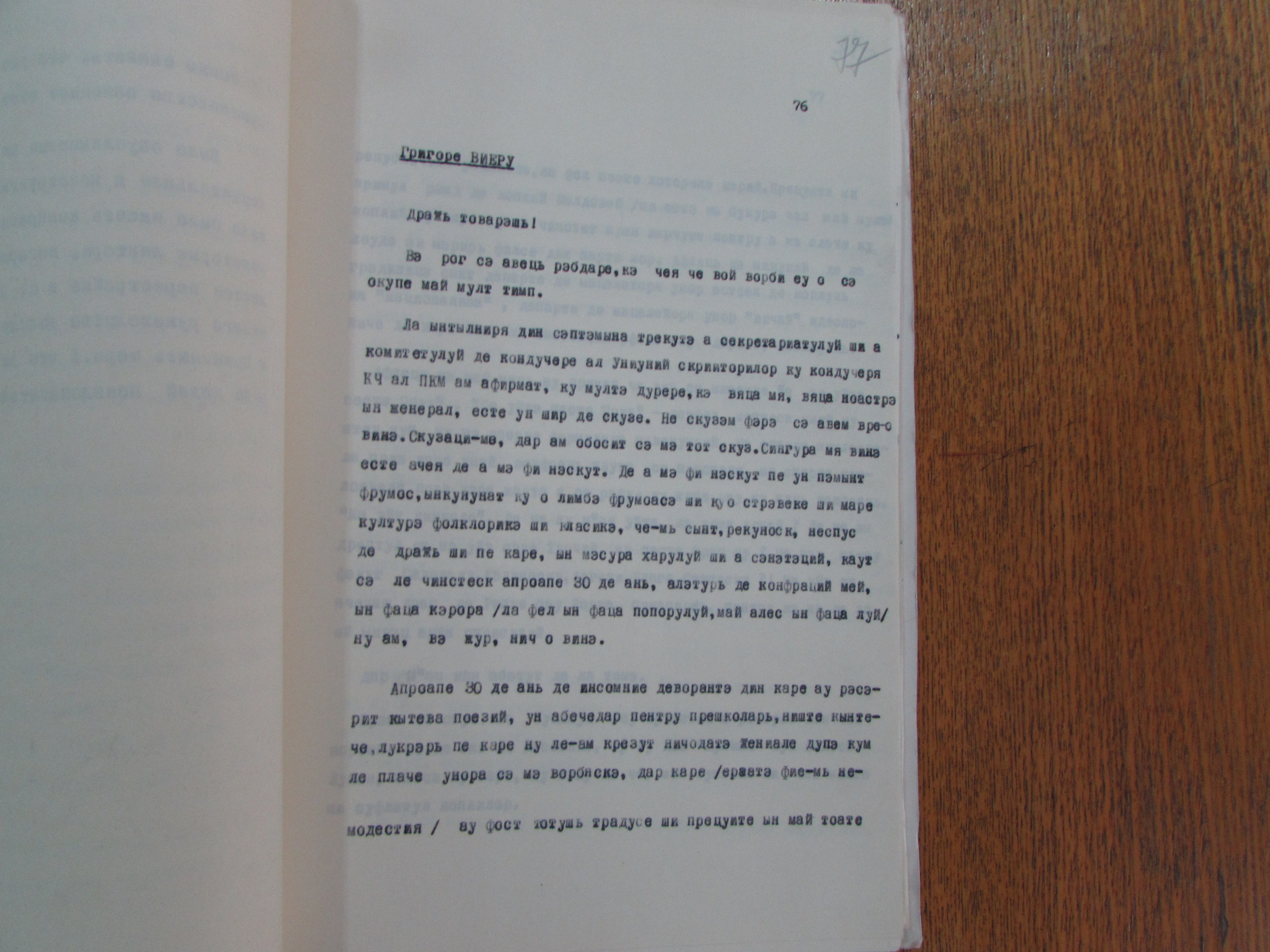“Do you know that, behind our literary distinctions and prizes, we are witnessing, in broad daylight, a real linguistic disaster? Do you know how distorted and ugly is today the speech of our children, youth and even older people? Do you know that the few Moldavian kindergartens in Chișinău are full to the brim and it is impossible to enrol your child there? Do you know that, out of seventeen hours of TV broadcast every day, barely two or three, and sometimes even fewer, are reserved for TV shows in our native language?!...Do you know that our villages, which preserved our national being, are being depleted of their people and their soul?”