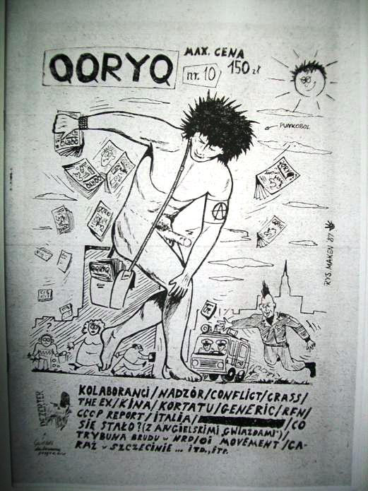 The majority of the editions of ‘QQRYQ’ was printed on Xerox from one hundred to two hundred copies. The matrices were made by hand, in a collage technique, from scraps of official newspapers and magazines, small text lines prepared on typewriter, hand written articles, photos, graphics, and comics. The first issue published on the offset appeared in 1990. It was also the first issue prepared with a usage of a computer. Against this background of Xerox and offset techniques of printing, the tenth edition of ‘QQRYQ’ seems to be very original. This edition was published by screen print, which was hardly ever practiced as a way of bringing out punk fanzines. The screen printing technique was extremely labour-intensive and took a lot of time to print even a relatively small number of copies. Another unusual fact about the tenth number of ‘QQRYQ’ was a usage of the official foolscap because of lack of different kinds of paper. The content of the issue did not vary so much from the rest of the editions, but worth mentioning were the graphics by Mirosław ‘Maken’ Dzięciołowski, reggae DJ, promoter, and alternative scene activist in the late 1980s in Poland. Dzięciołowski was one of a few regular contributors of ‘QQRYQ’.
